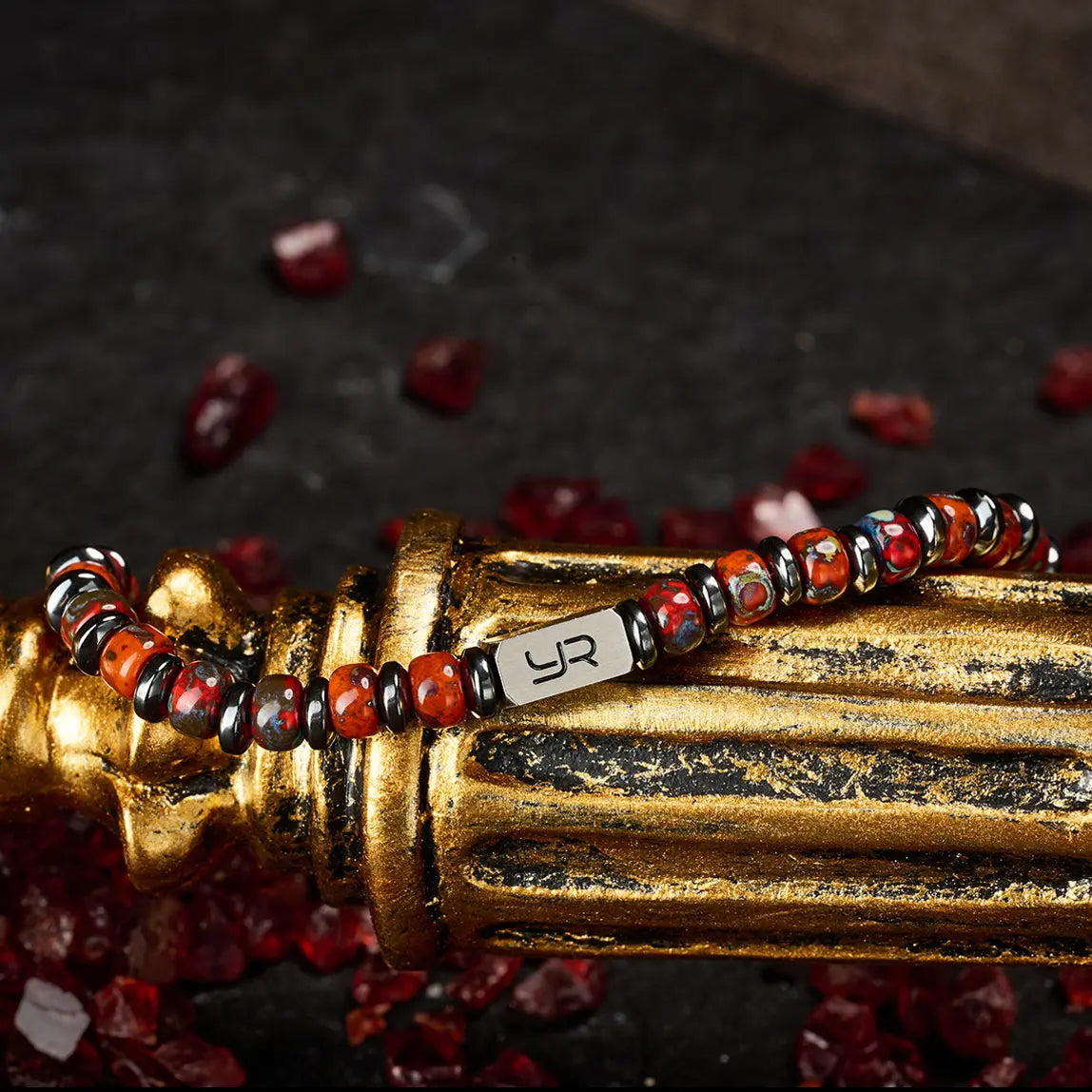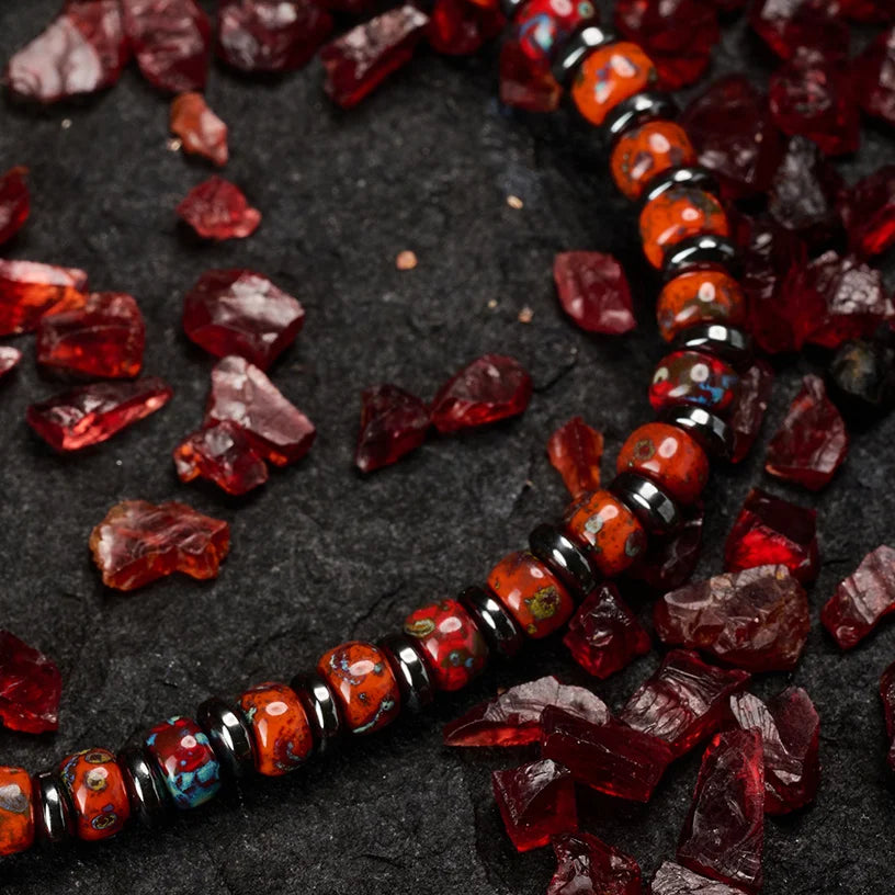 - Crafted with red Miyuki beads and Hematite, this bracelet draws inspiration from the flame’s “destruction and rebirth, refinement and purification, freedom and chaos.”