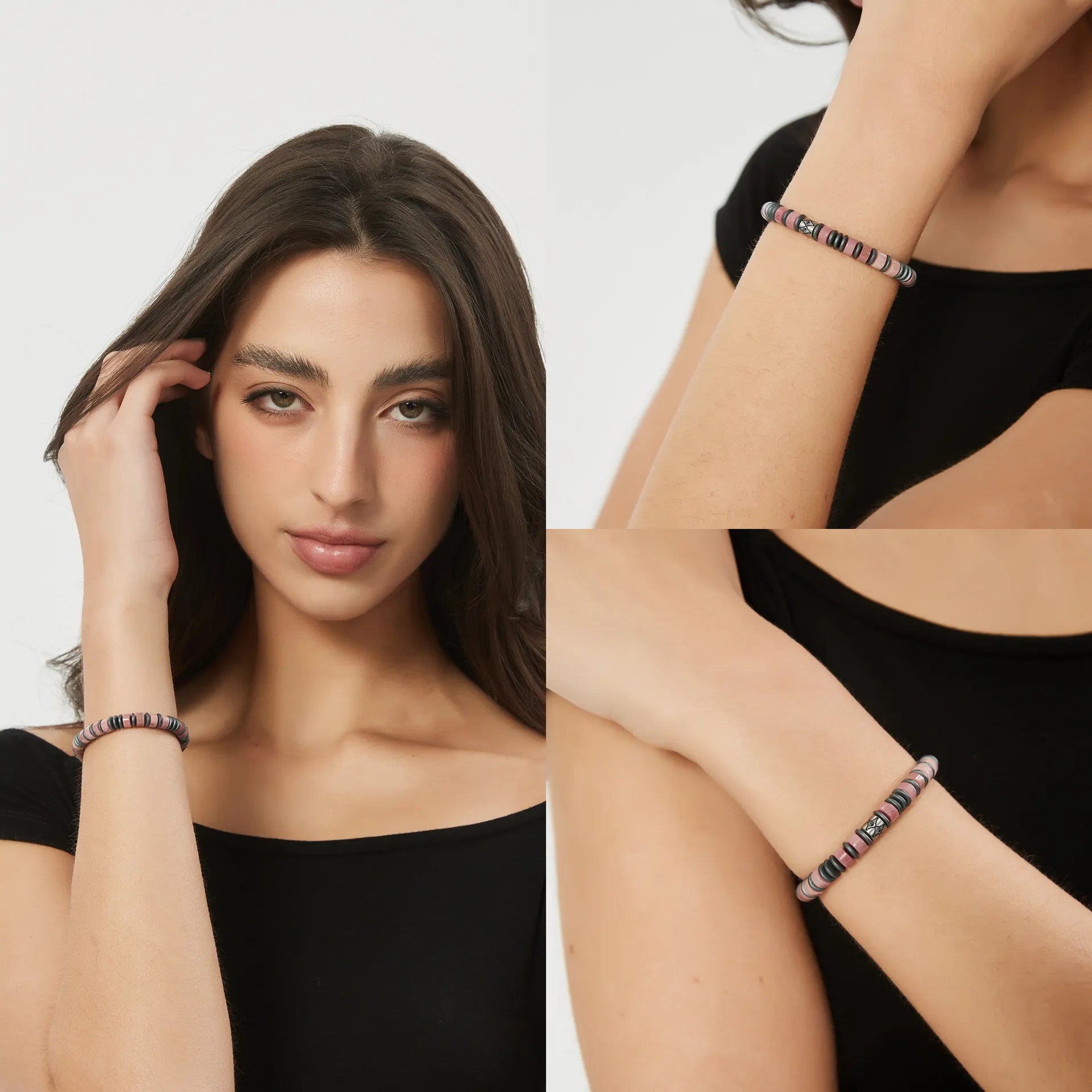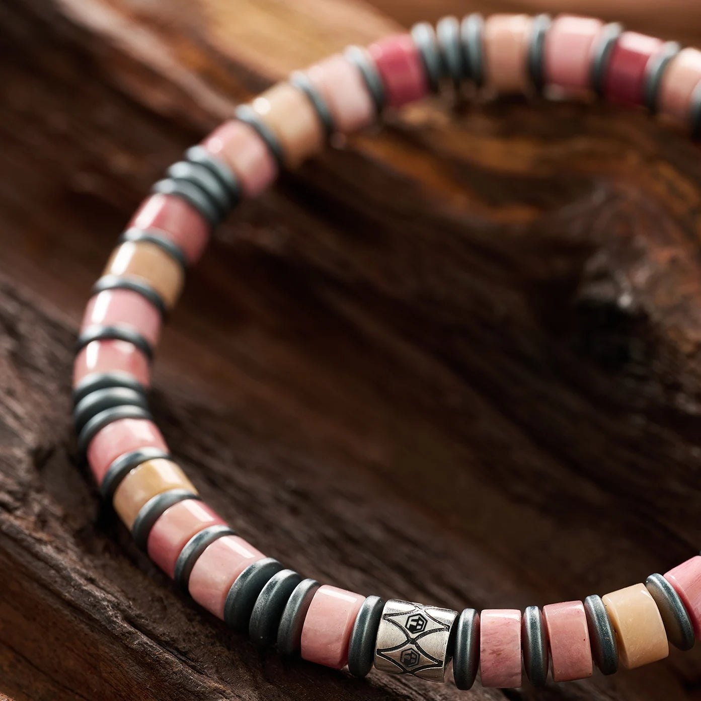 - This bracelet features a refined blend of natural Rhodochrosite and Hematite disc beads, offering a modern balance of color, texture, and understated luxury.